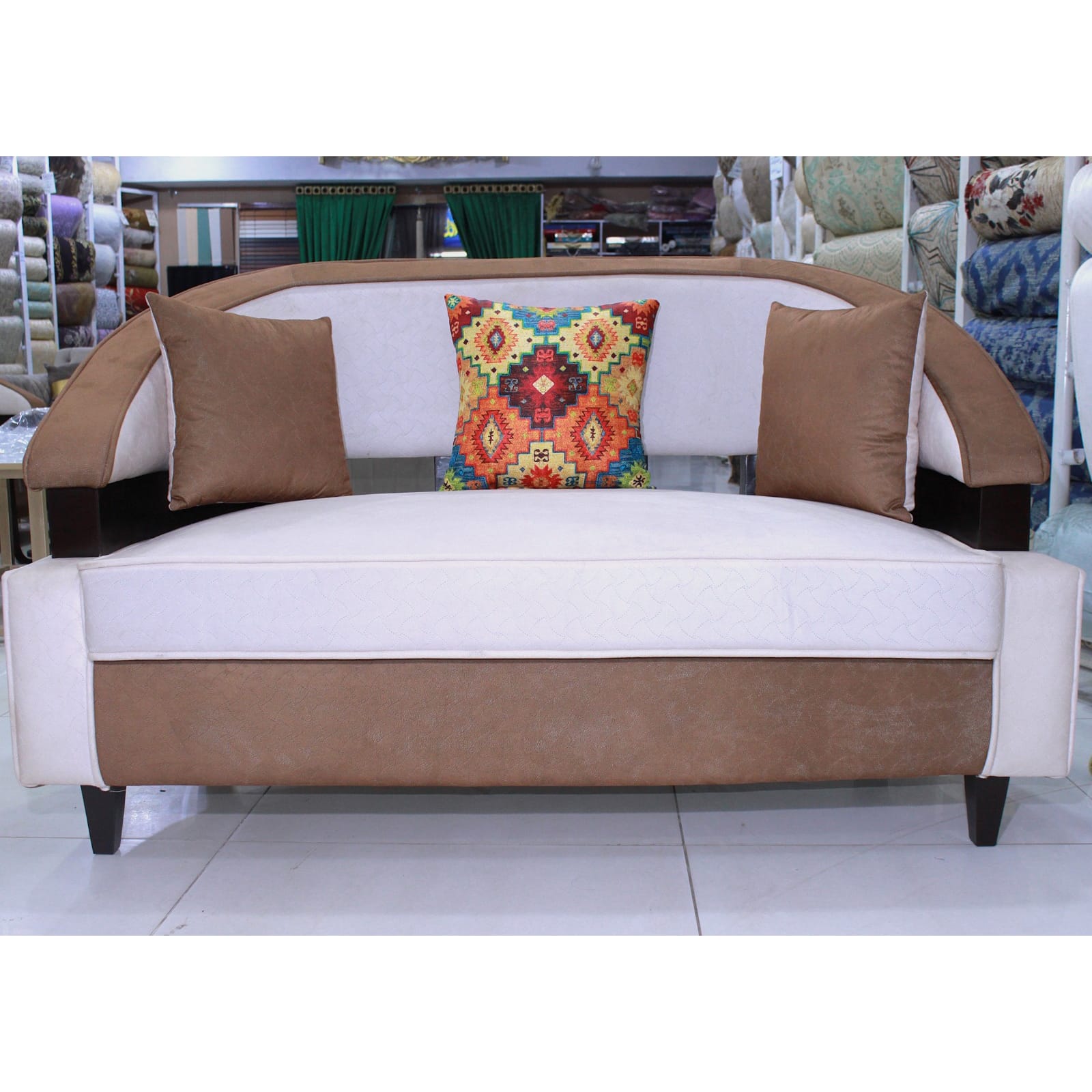 Upholstered in a sophisticated two-tone palette of warm taupe and crisp cream, the loveseat provides a neutral canvas that can be easily styled to fit your personal decor. The bold, geometrically-patterned accent cushion in vibrant earth tones adds a pop of color, making this piece a stunning focal point. Built with sturdy wooden legs for reliable support, the Sedona Modern Loveseat is crafted for both durability and style, offering a comfortable retreat for you and a loved one to relax and connect.