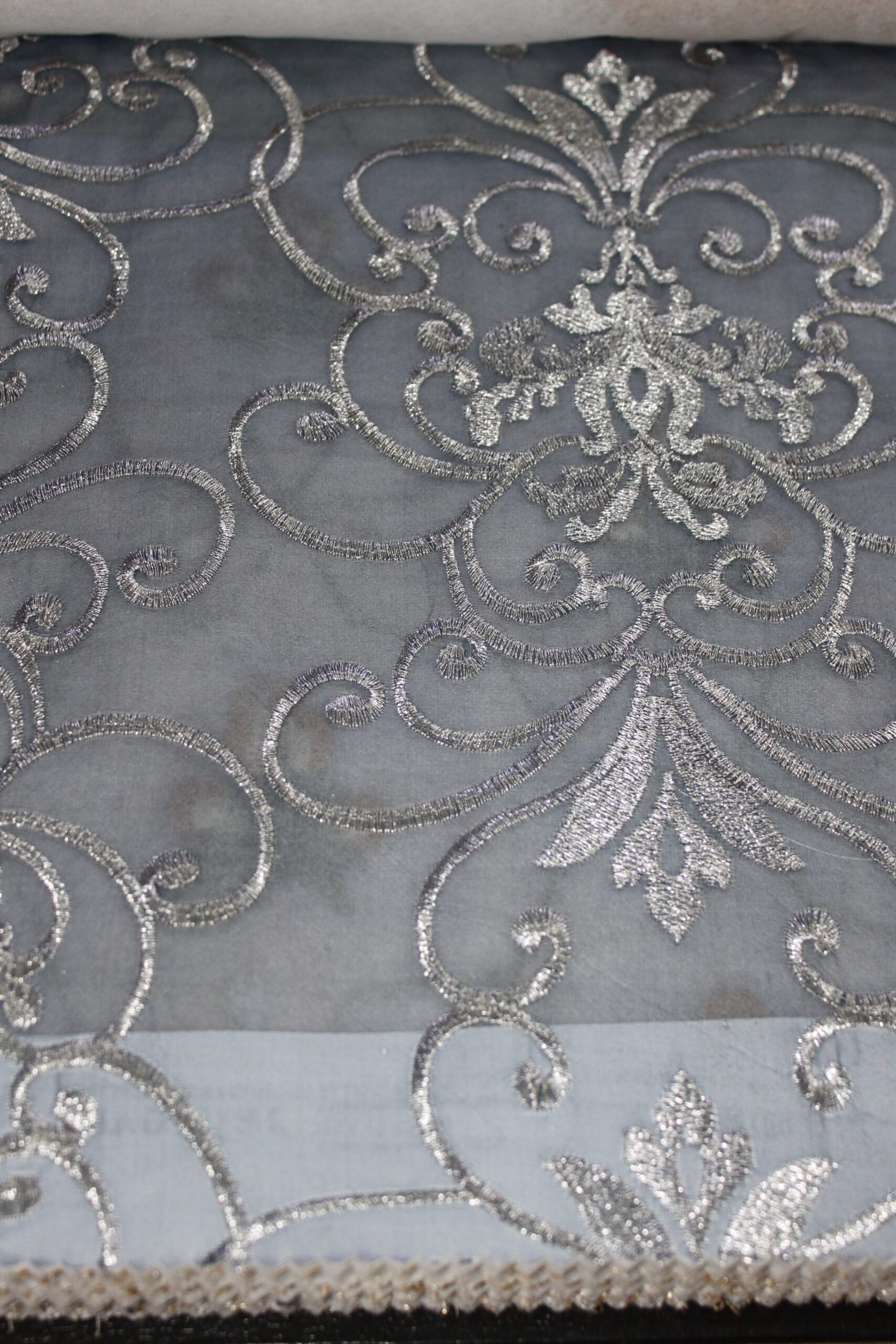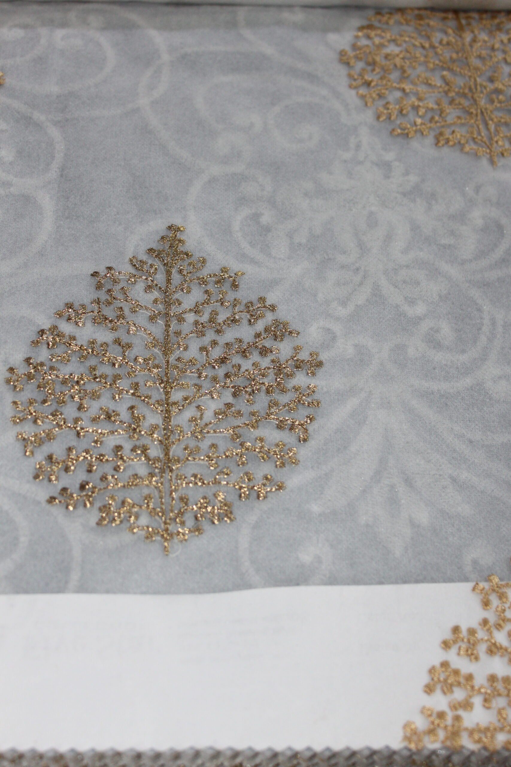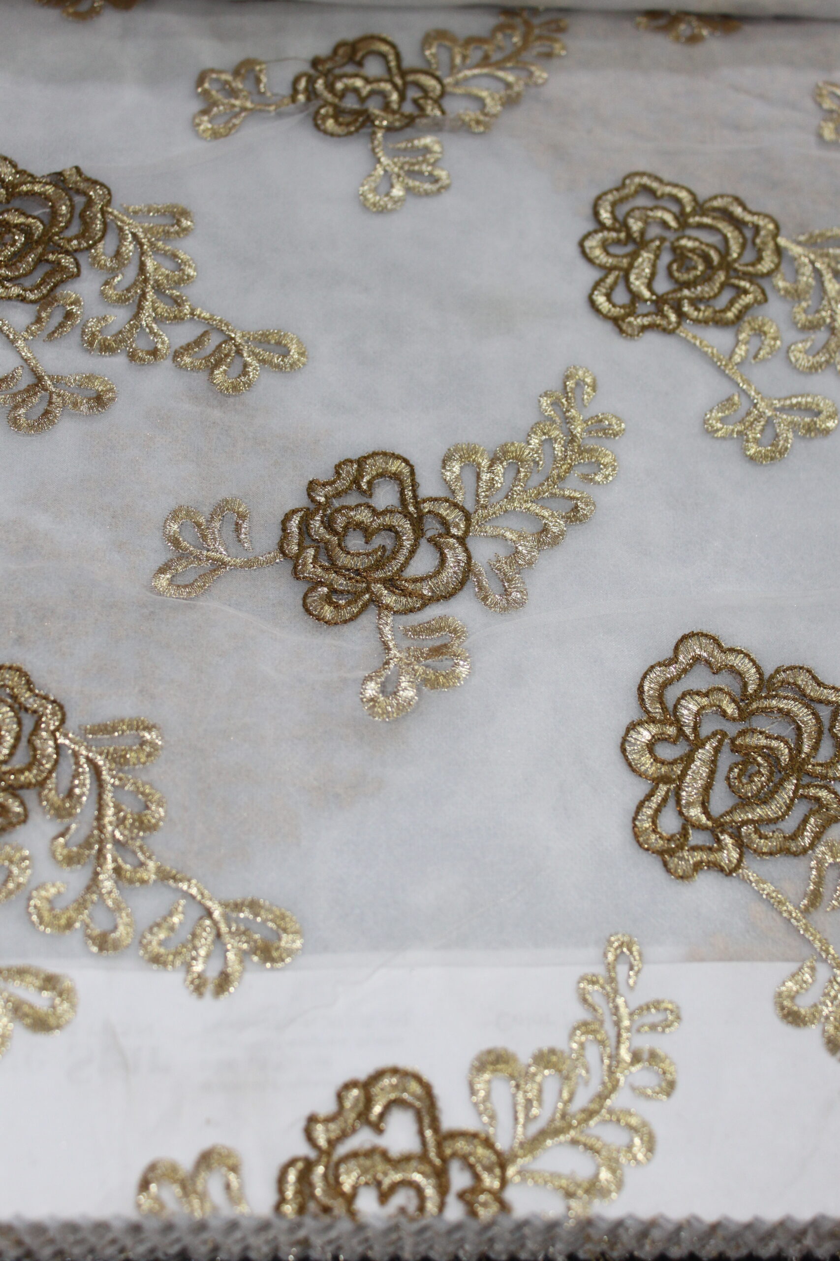An elegant premier organza featuring intricate metallic embroidery on a soft, sheer base. The design showcases ornate diamond medallions with delicate lattice detailing, interspersed with refined floral motifs, all rendered in shimmering gold and champagne tones. Lightweight and translucent, this organza allows natural light to filter through gracefully while adding a luxurious decorative layer. Ideal for statement curtains, layered drapery, or formal interiors, it brings a sophisticated, regal touch to living rooms, dining areas, and special spaces