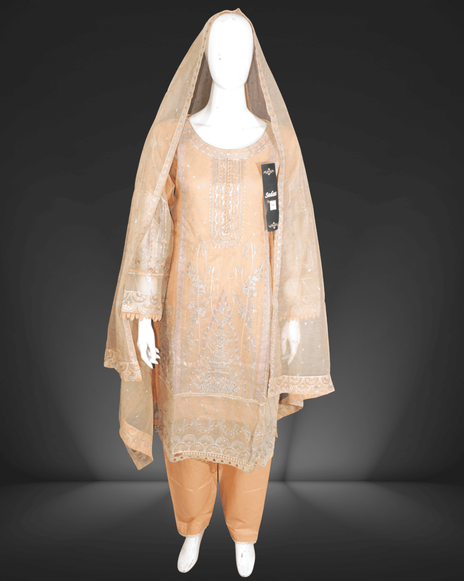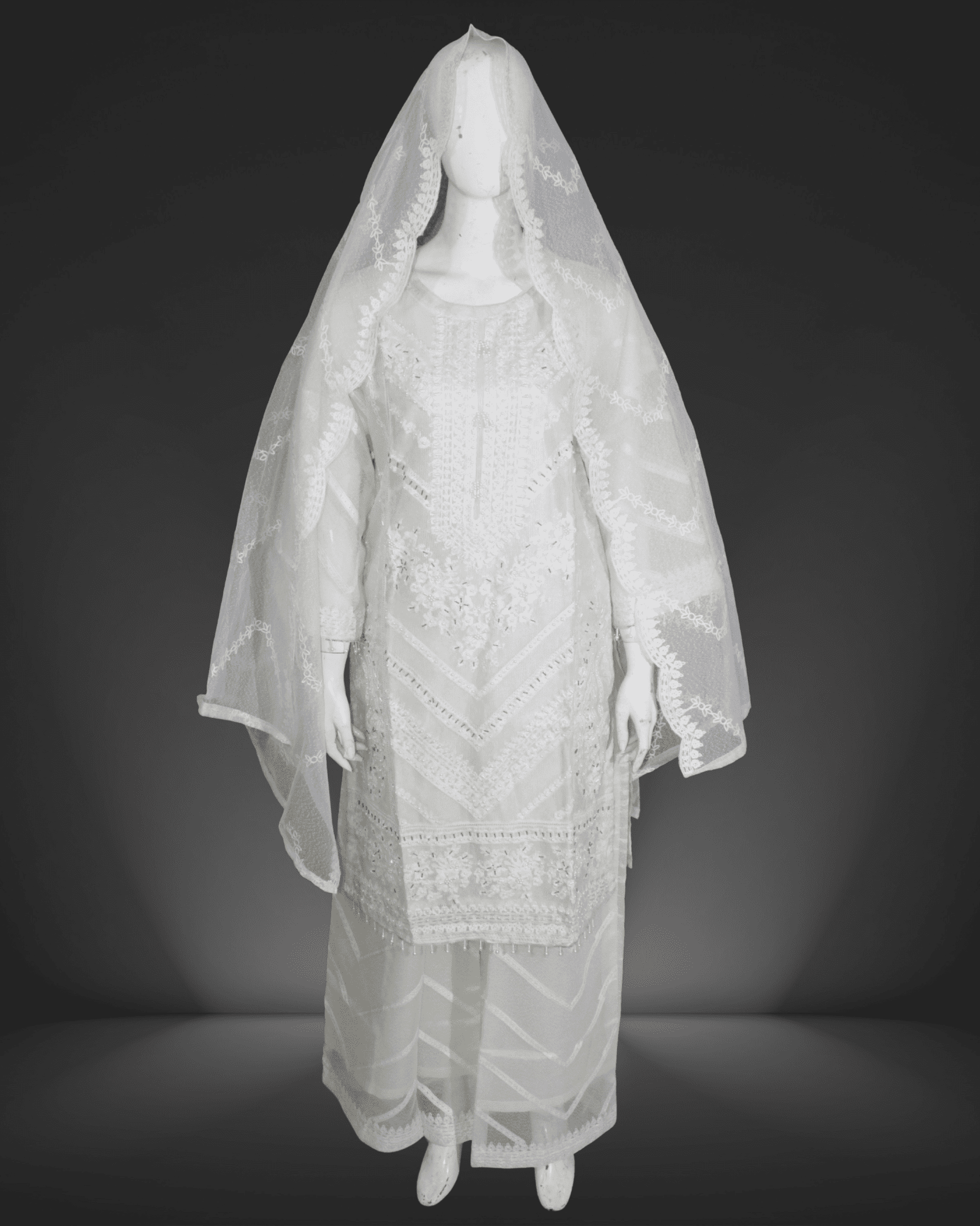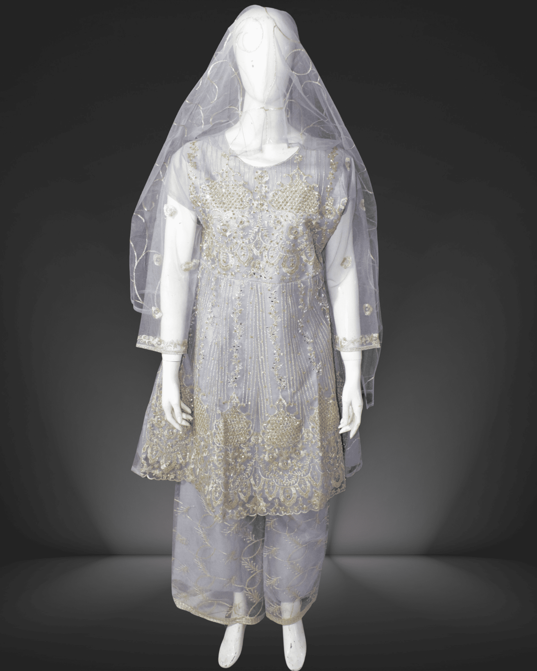 Outfit Details: This ensemble features a beautifully embroidered long kameez adorned with intricate silver threadwork, sequins, and delicate floral motifs.