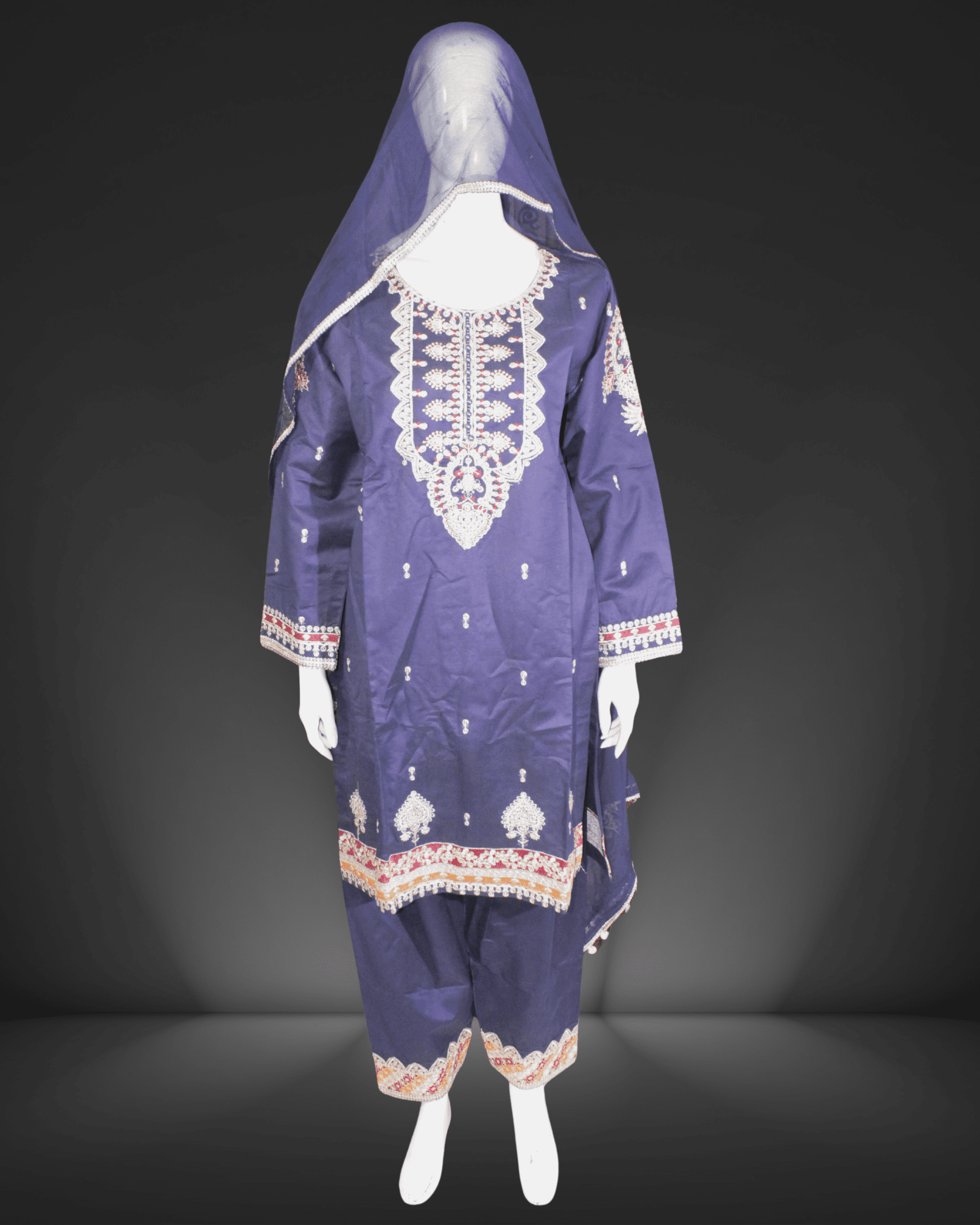 Dupatta: Paired with a contrasting navy blue embellished dupatta, detailed with silver thread embroidery and borders, perfectly completing the royal appearance.