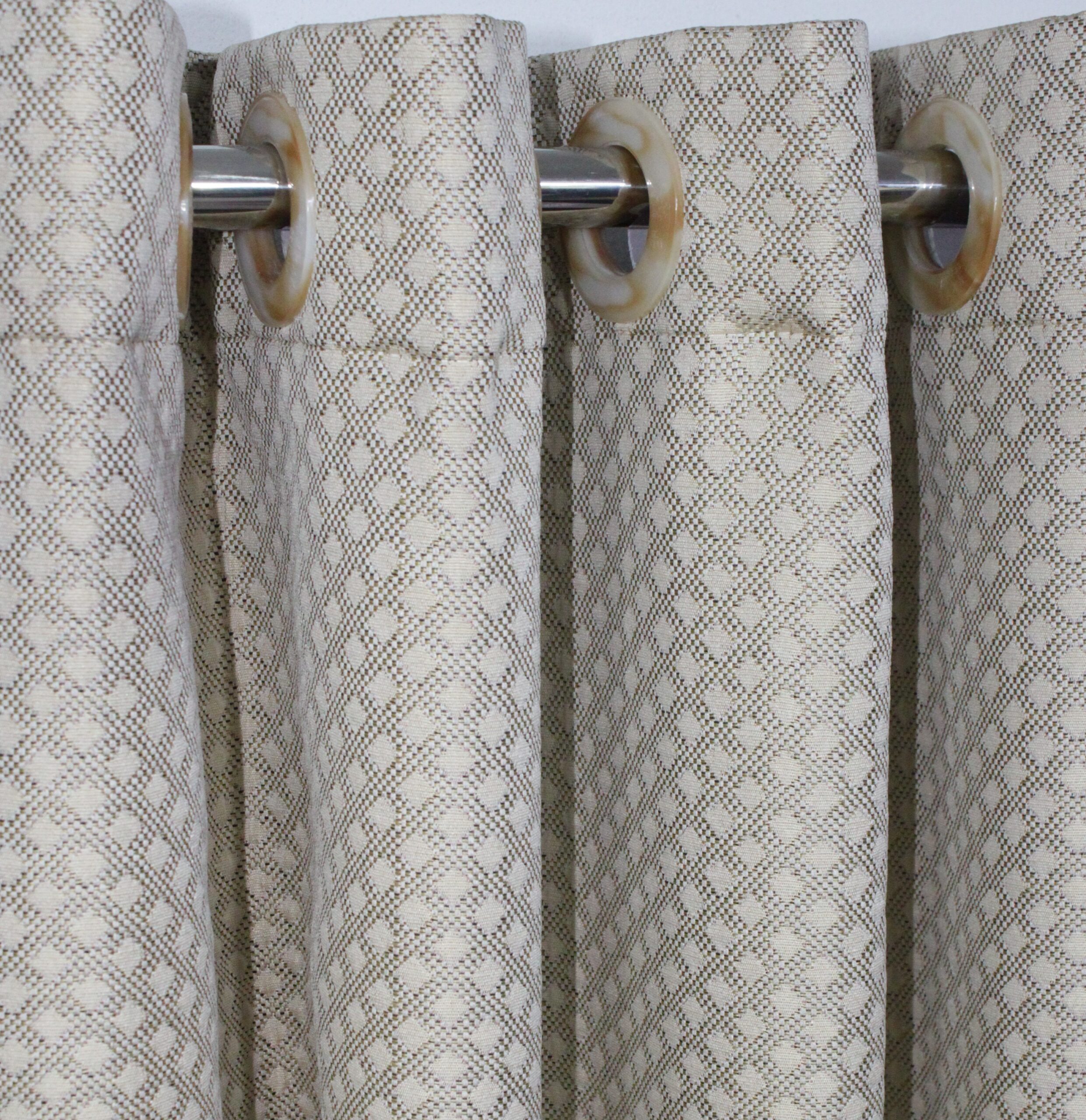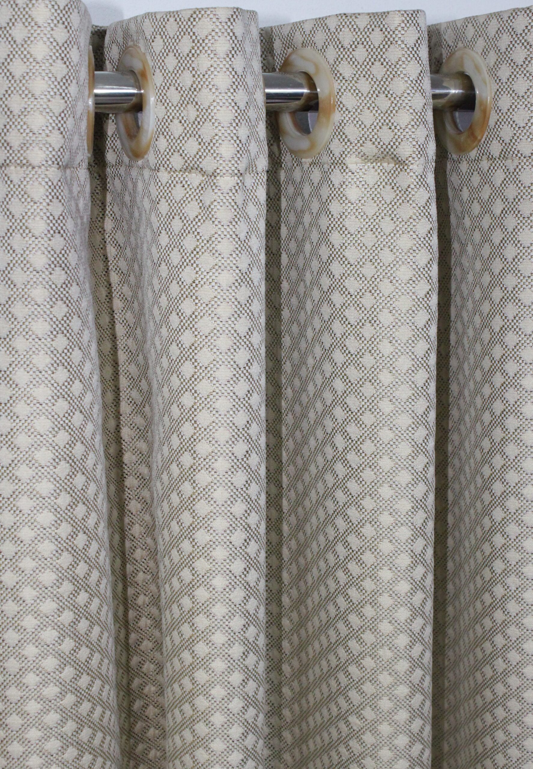 This curtain is made from a durable, textured fabric in a neutral beige tone, decorated with a small, repeating diamond pattern that adds a touch of sophistication without being overpowering. The surface has a slightly woven appearance, giving it depth and character. It features sturdy metal grommets at the top, allowing for smooth and easy installation on a standard curtain rod. The soft color and subtle design make it a versatile choice for living rooms, bedrooms, or offices, blending well with a variety of interior styles.